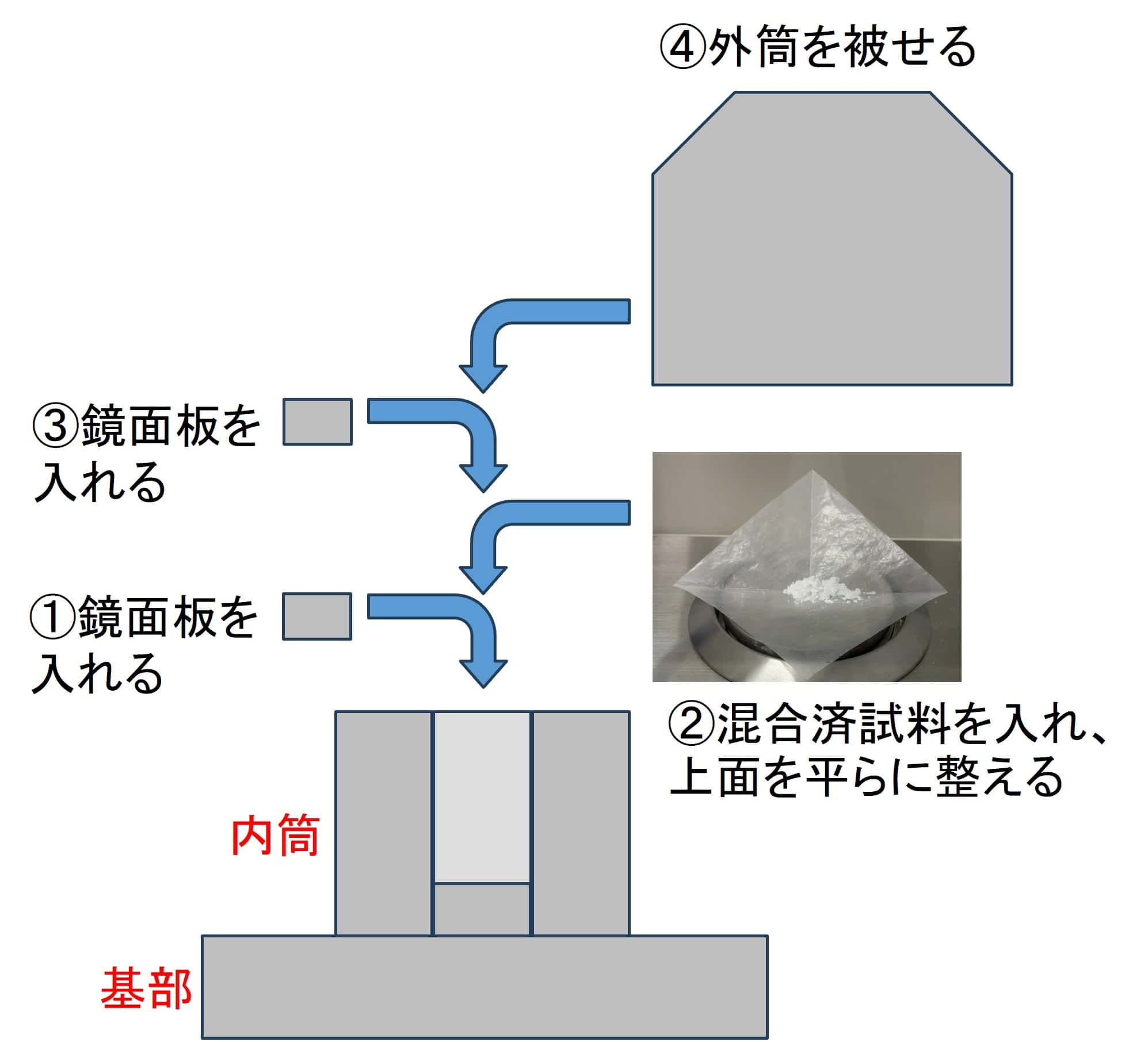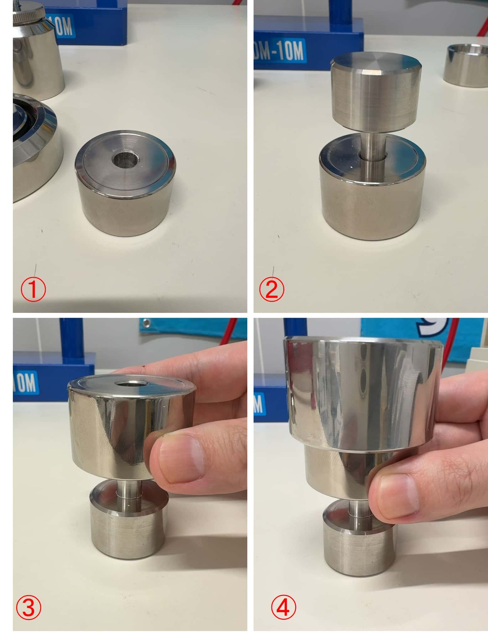 ①試料受台を押さえつつ油圧プレスでわずかに加圧し、試料受台を軽く押し込む