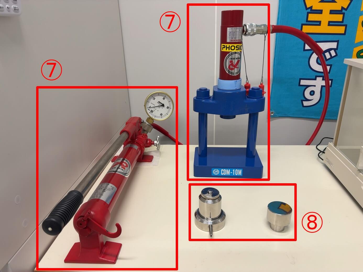 ②油圧プレスの圧力を開放し、錠剤成型機を取り出す