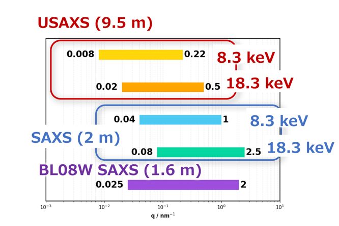 USAXS:0.0080~0.22 ㎚-1(8.3 keV時) SAXS :0.0400~1.00 ㎚-1(8.3 keV時) |